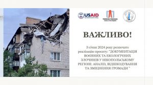 МЕТА ПРОЄКТУ: документування воєнних та екологічних злочинів, що вчинені рф у місті Нікополі та Нікопольському районі Дніпропетровської області, підготовка аналітичного Звіту для подальшого відшкодування збитків, зміцнення місцевої громади через інформаційно-просвітницькі заходи та створення координаційної платформи для обговорення та вирішення проблем регіону.